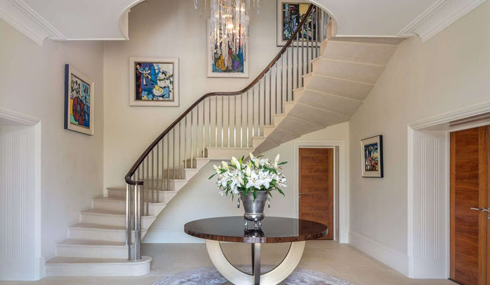 This elevated country house enjoys open southerly views towards Churchill, and sits at the heart of a 231-acre Cotswold Estate. Approached by a long drive that winds through farmland and landscaped parkland, the house is entered beneath a striking tetrastyle portico, opening into a hall with a dramatic double height spiral staircase.